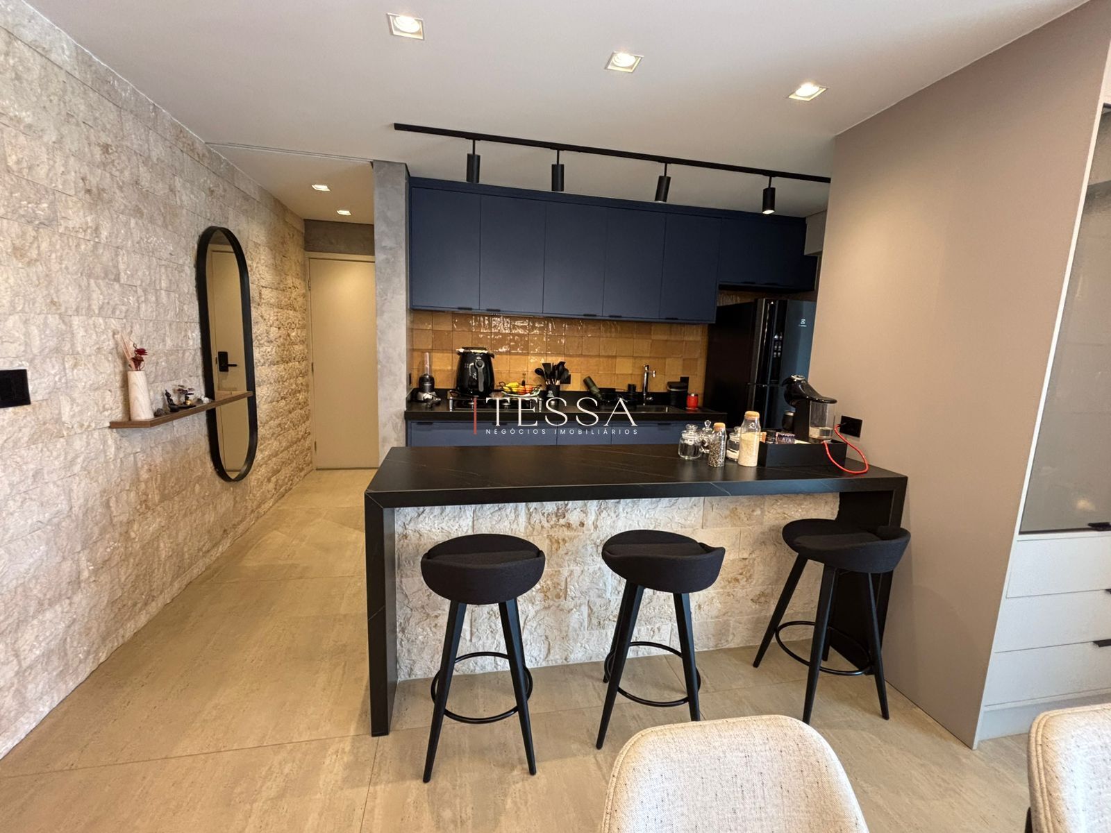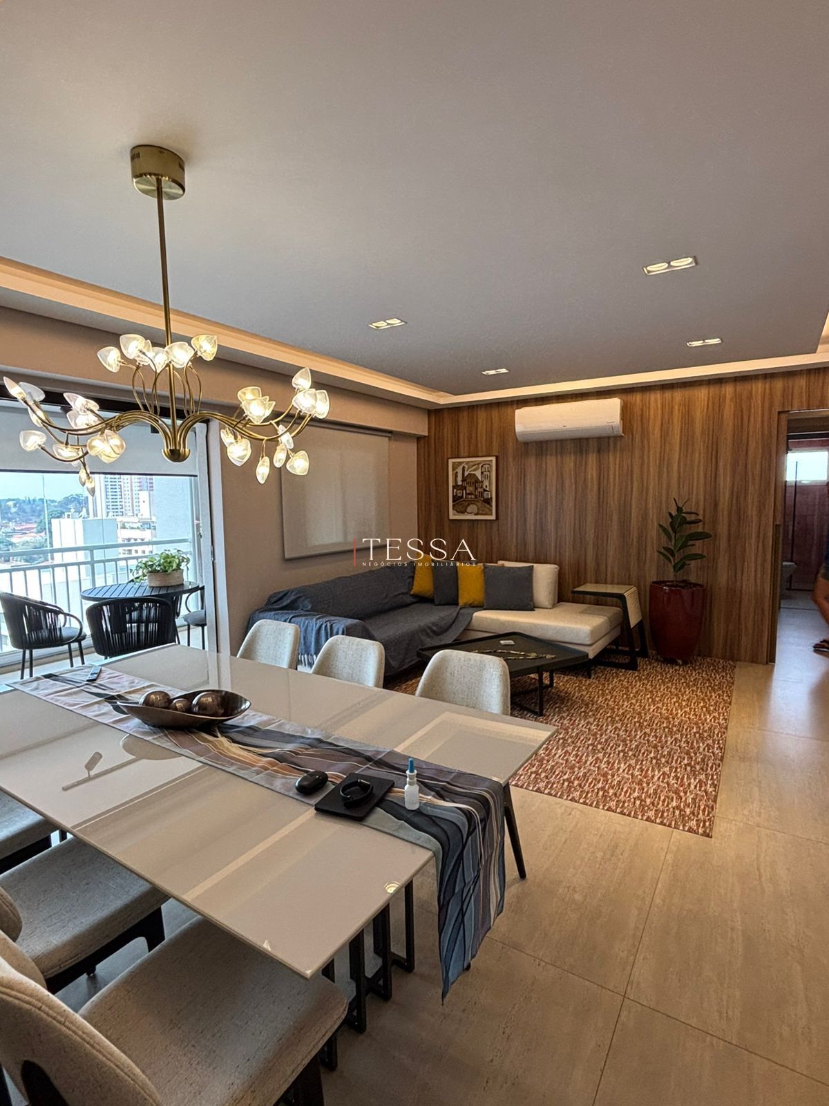 A entrada conduz a um hall com lavabo, que se integra a uma ampla sala para dois ambientes, climatizada e com excelente iluminação natural. A área social se conecta à cozinha estilo americana, moderna e funcional, equipada com armários planejados e eletrodomésticos embutidos — cooktop, coifa, forno e micro-ondas — criando um ambiente prático e elegante para o dia a dia. A área de serviço é reservada e conta com armários planejados.