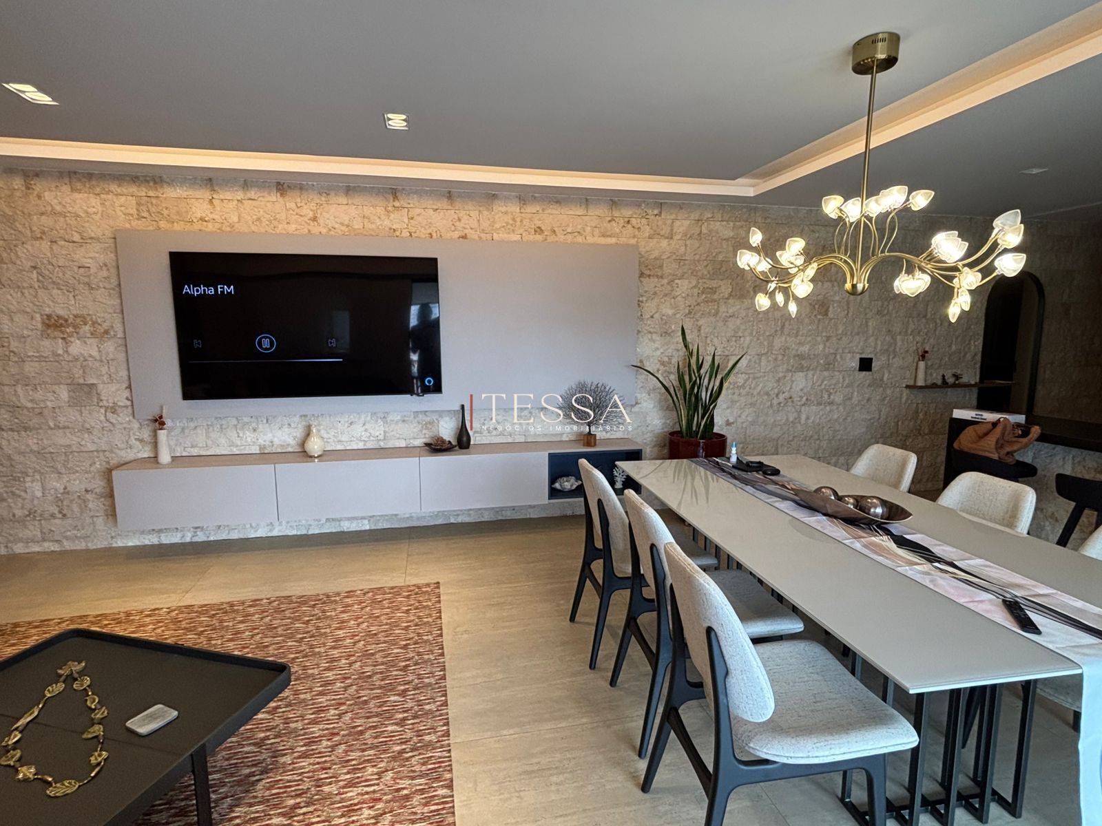 Os acabamentos reforçam o padrão elevado do imóvel, com paredes em travertino bruto, piso em travertino e mármore no lavabo, evidenciando um projeto sofisticado e atemporal. O apartamento conta ainda com duas vagas de garagem, agregando comodidade à rotina.