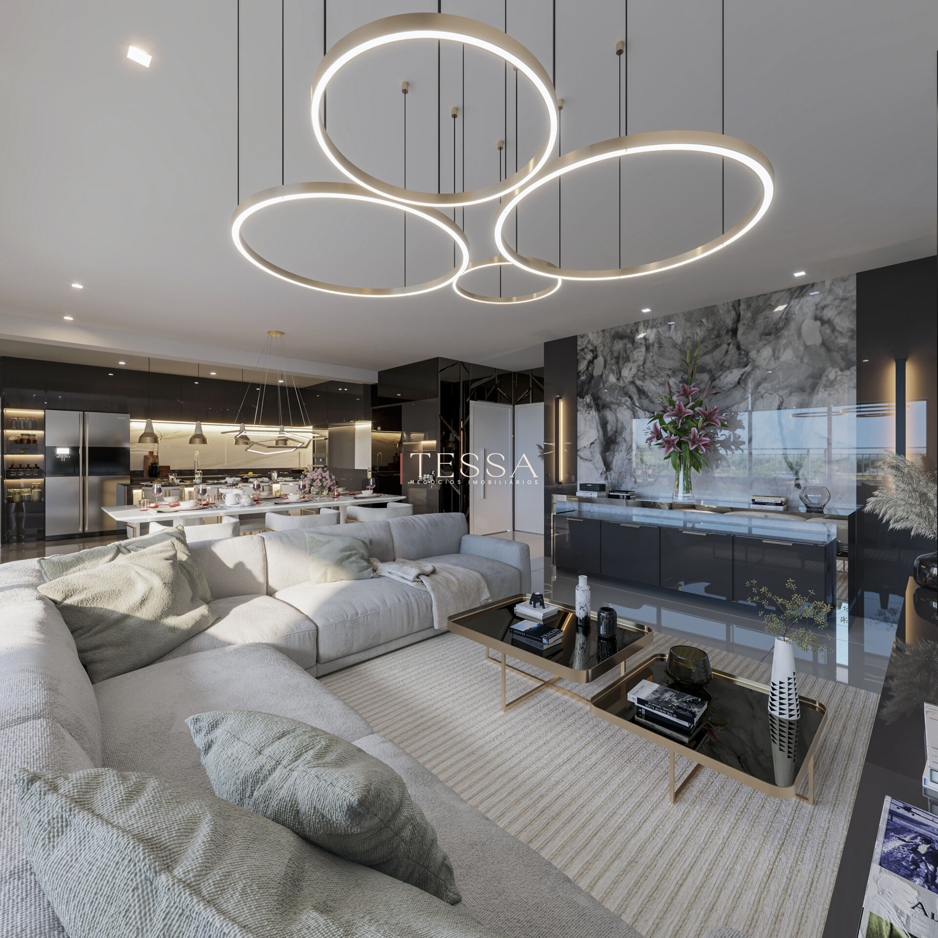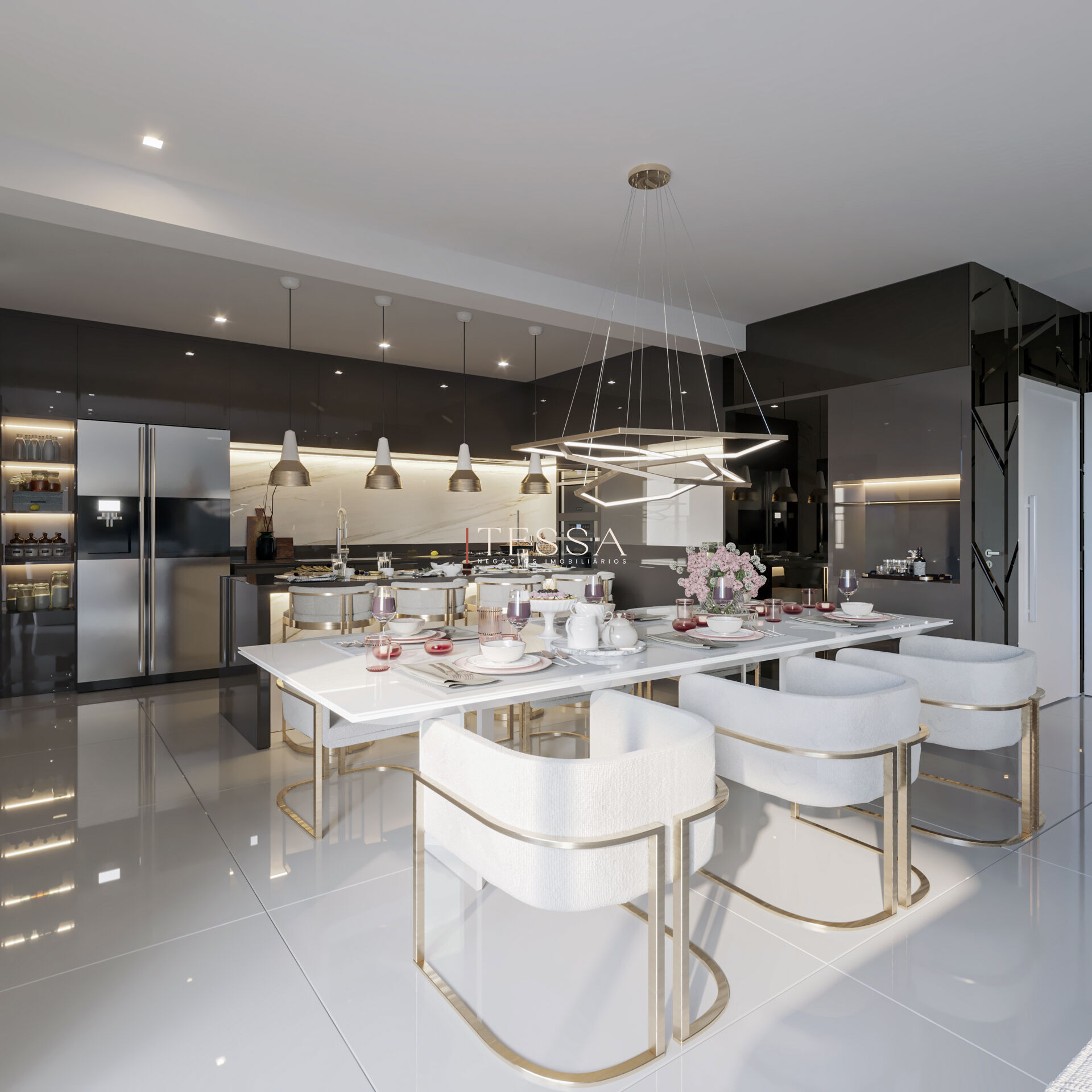 - Hall de entrada imponente, com pé-direito quádruplo de aproximadamente 12 metros, reforçando a sofisticação do projeto.