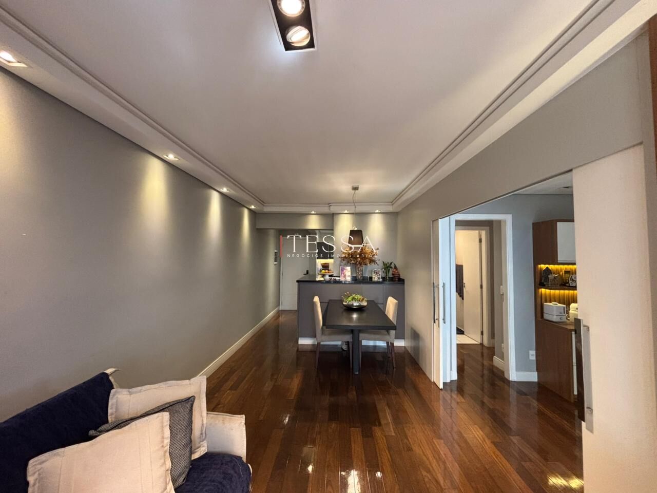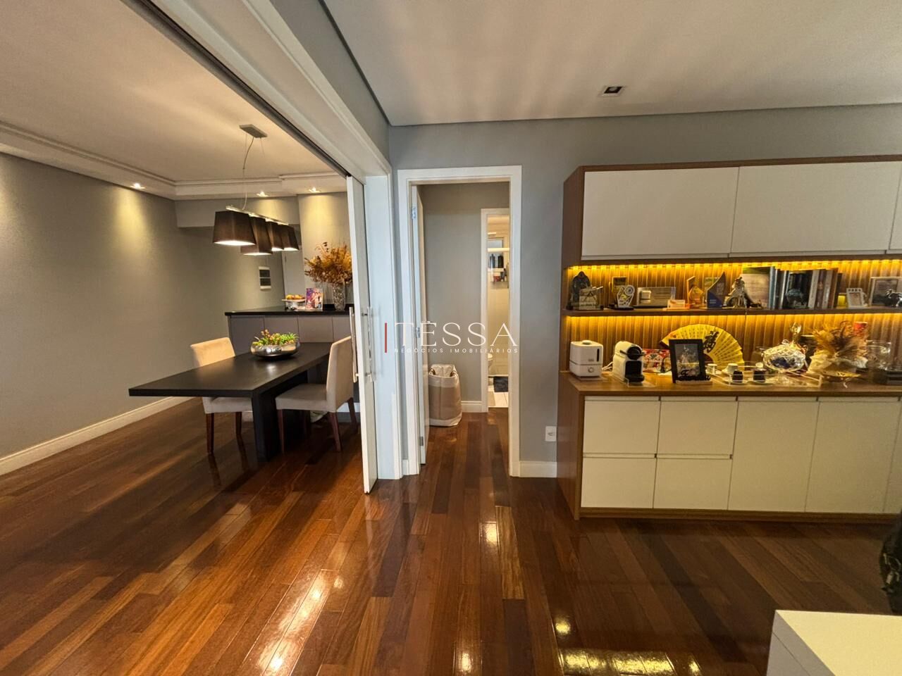 O imóvel se destaca pelo piso em madeira, projeto de iluminação e marcenaria planejada, que reforçam o padrão de acabamento e proporcionam praticidade no dia a dia.