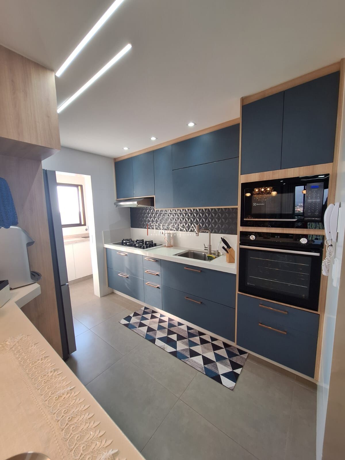 A cozinha é moderna e totalmente planejada, com armários sob medida em tons contemporâneos, layout funcional e eletrodomésticos embutidos que permanecem no imóvel, mantendo a estética limpa e a praticidade do ambiente. A lavanderia é reservada e bem ventilada.