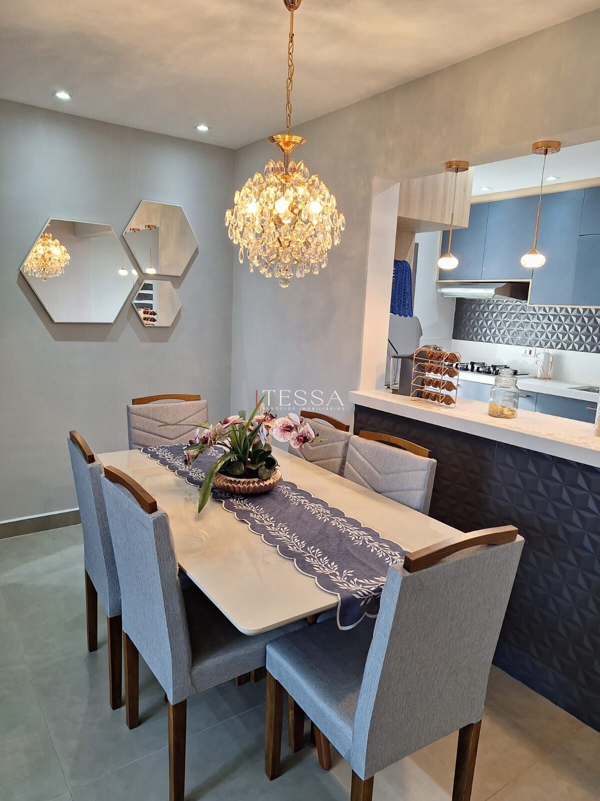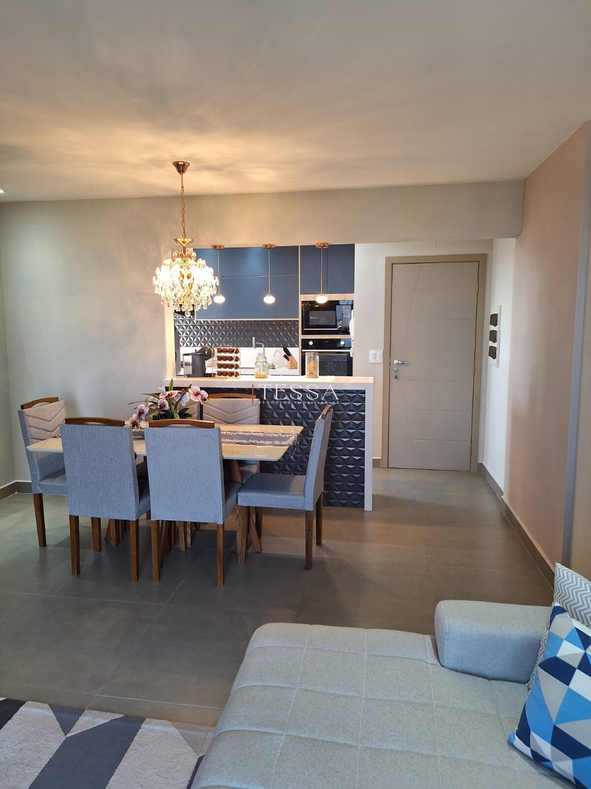 A área social é um dos grandes destaques: sala de estar e jantar integradas à cozinha estilo americana, com bancada em pedra, iluminação pendente e marcenaria sob medida, criando um espaço acolhedor e elegante para o dia a dia e para receber. O projeto luminotécnico linear e os acabamentos atuais reforçam o padrão do imóvel, enquanto a varanda proporciona vista aberta e excelente ventilação.