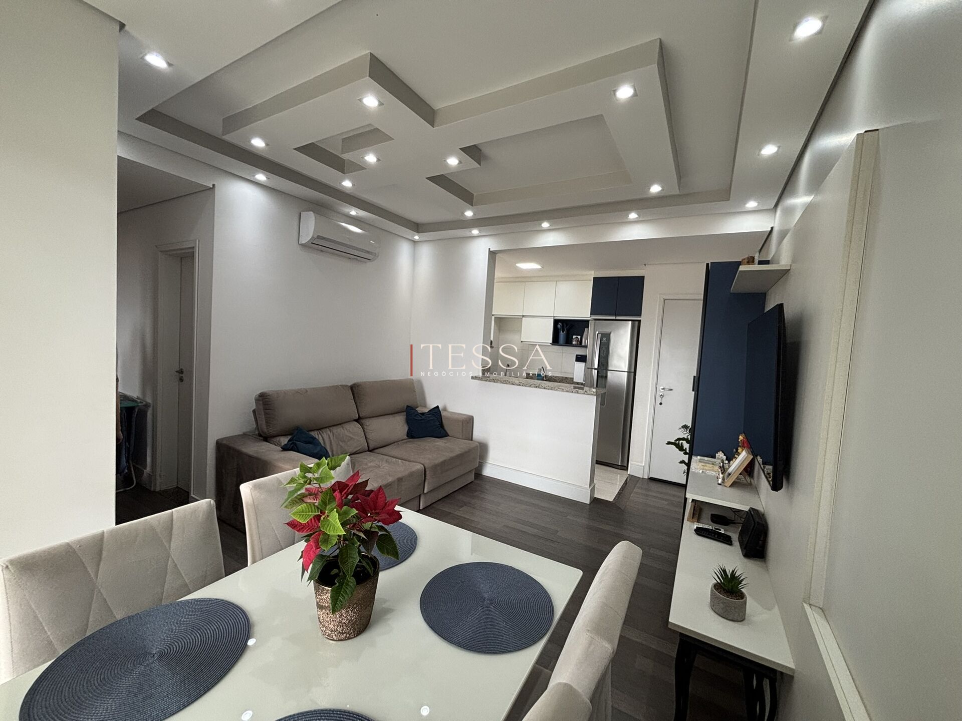 Os acabamentos reforçam o padrão do imóvel, com rebaixamento em gesso, piso em porcelanato nas áreas frias e piso em madeira da Indusparquet na sala e dormitórios, trazendo sofisticação, conforto térmico e um acabamento de alto padrão.