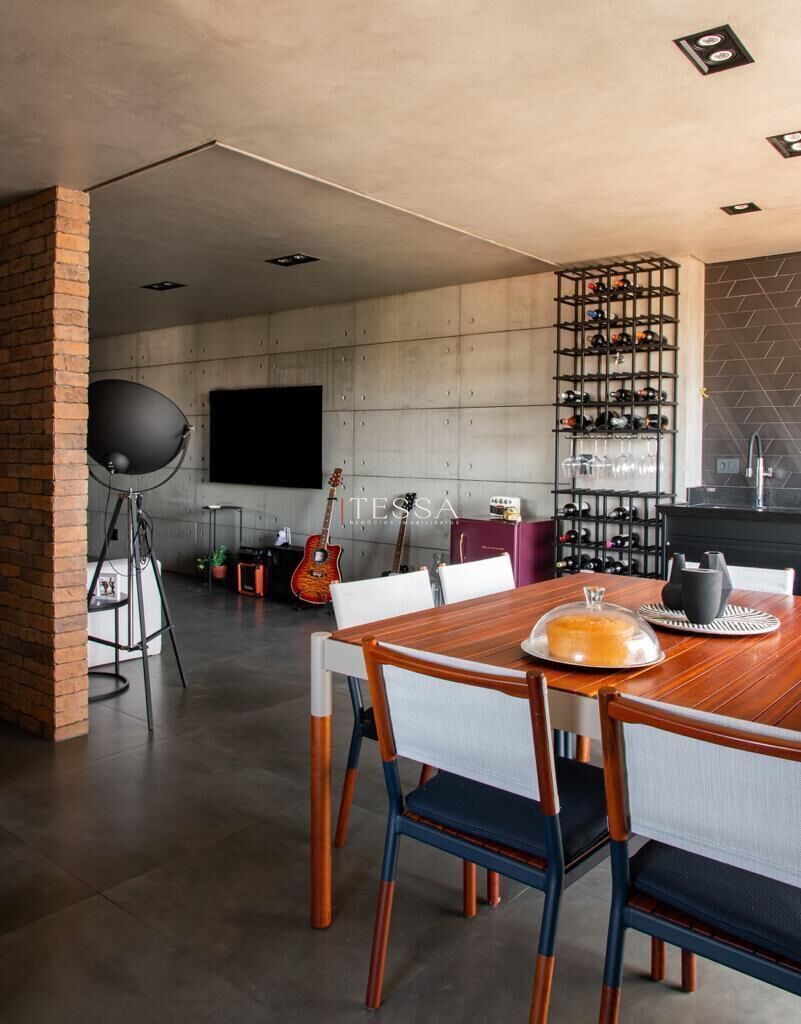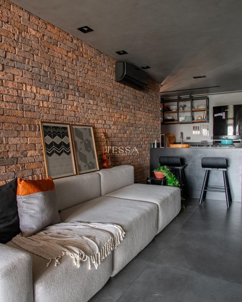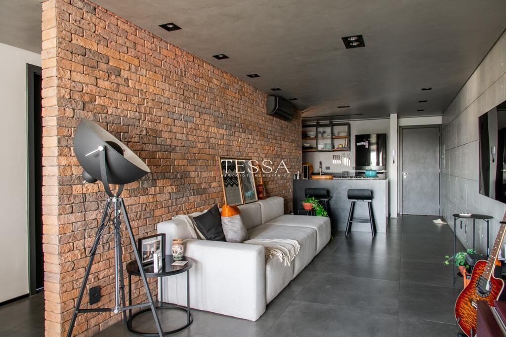 O conceito industrial conduz toda a identidade do apartamento, com elementos marcantes como paredes em tijolinho aparente e concreto, que trazem textura, profundidade e autenticidade aos ambientes