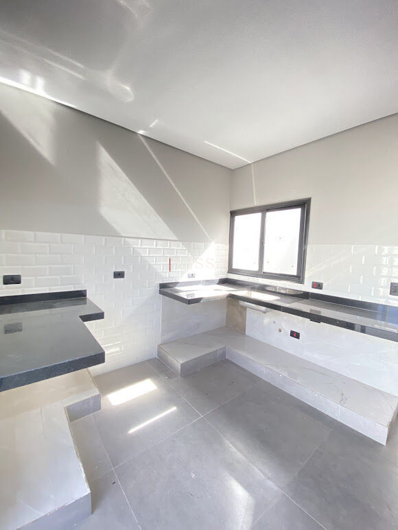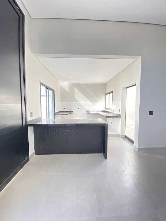 Cozinha em conceito aberto, com bancada e pia em granito.