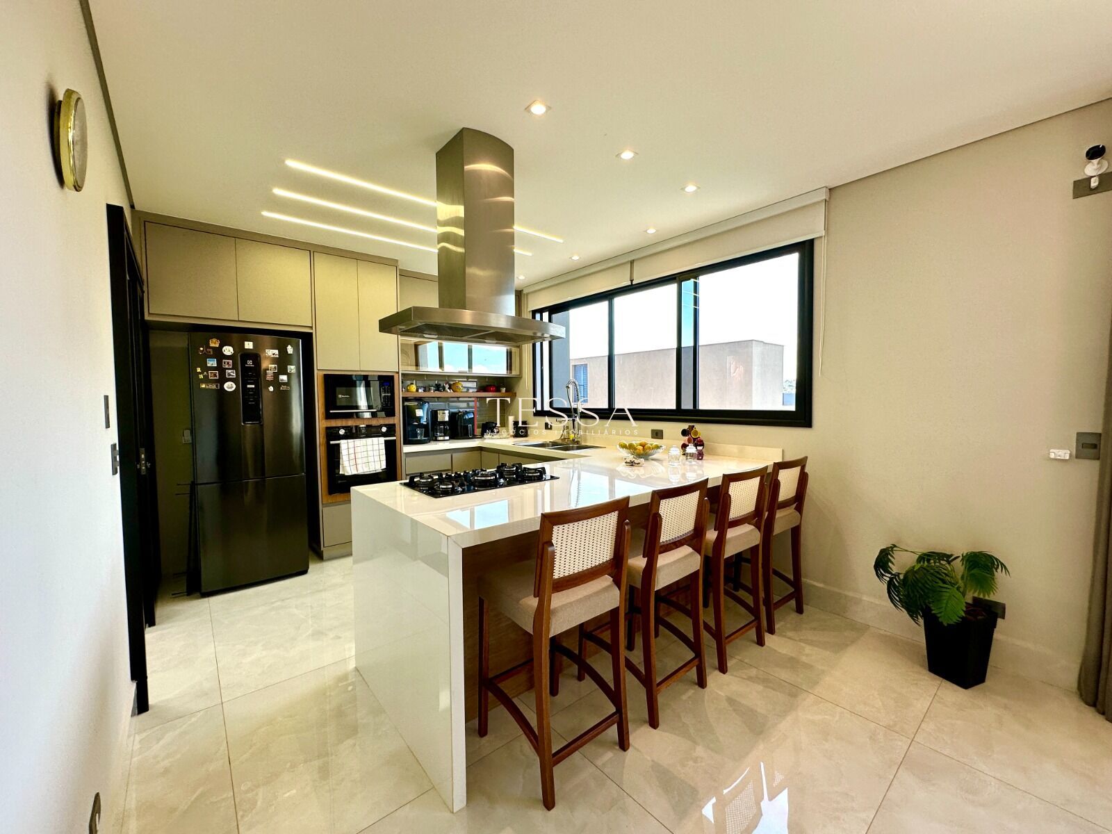 A área social é composta por sala privativa para dois ambientes e espaço integrado à área gourmet completa, criando um ambiente acolhedor e ideal para receber. A cozinha, em estilo americano, conta com armários planejados e excelente funcionalidade, além de área de serviço reservada.
