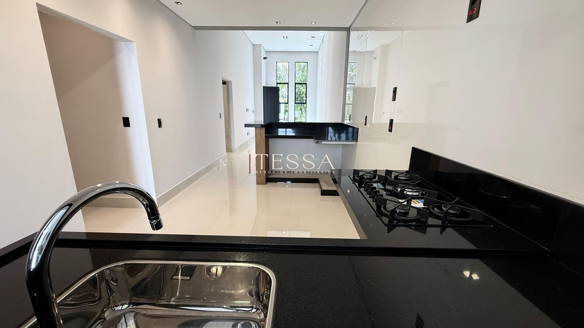 O imóvel conta com sala ampla integrada à cozinha, proporcionando um ambiente moderno e aconchegante. A cozinha possui balcão em península com granito preto, agregando elegância e praticidade ao dia a dia.