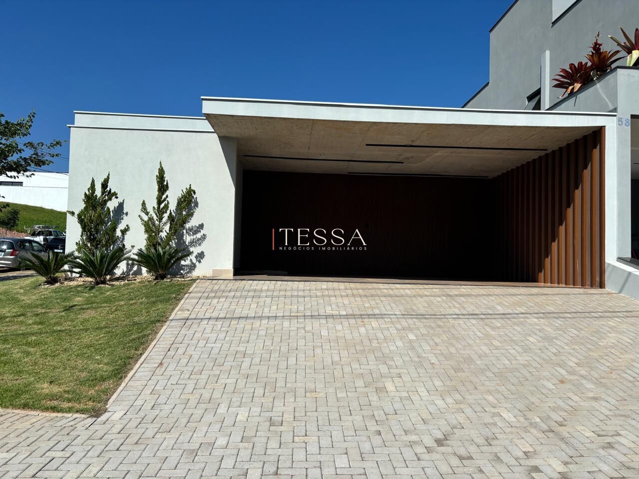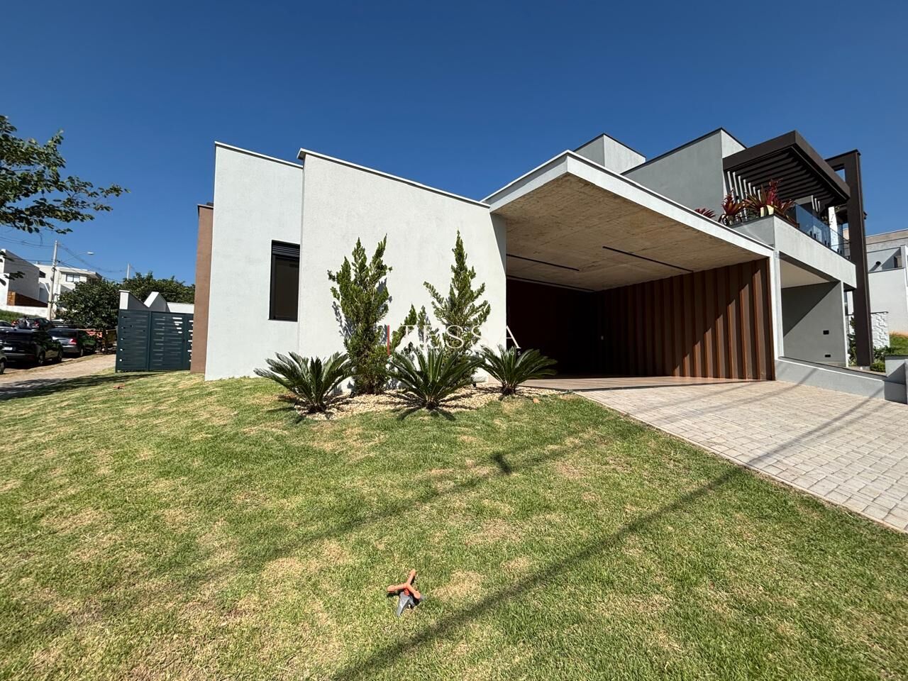 Logo na chegada, o projeto se destaca pela fachada imponente com linhas retas e volumetria moderna, além do paisagismo que valoriza a entrada da residência.